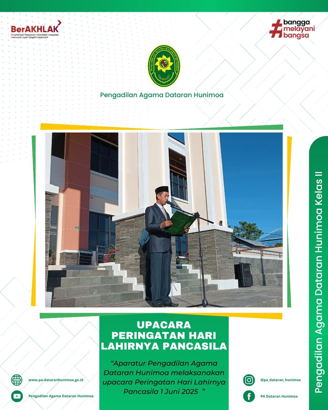 Seram Bagian Timur, 2 Juni 2025 Seluruh Aparatur Pengadilan Agama Dataran Hunimoa melaksankan Upacara Bendera memperingati Hari Lahir Pancasila Tahun 2025 di Halaman Kantor. Agenda upacara yang dilaksanakan tepat pukul 07:00 WIT serta dalam kesempatan pagi kali ini Wakil Ketua Bapak Alamsyah, S.H.I., M.H, selaku pembina upacara menyampaikan amanat dari Kepala Badan Pembinaan Ideologi Pancasila bahwa memperkokoh ideologi Pancasila berarti menegaskan kembali bahwa pembangunan bangsa harus selalu berakar pada nilai-nilai ketuhanan,kemanusiaan, persatuan, kerakyatan, dan keadilan sosial.