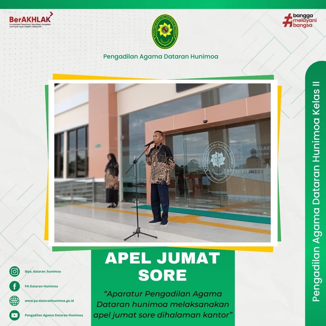 Seram Bagian Timur, 21 Februari 2025 aparatur Pengadilan Agama Dataran Hunimoa melaksanakan apel jumat sore di halaman kantor. Wakil Ketua selaku pembina menyampaikan terima kasih kepada aparatur karena agenda besar dan penting di bulan februari telah terlaksana dengan baik dan lancar, beliau juga menyampaikan semoga di akhir minggu depan menjelang Ramadhan kita selalu diberikan keberkahan dan kelimpahan rahmat Allah SWT.