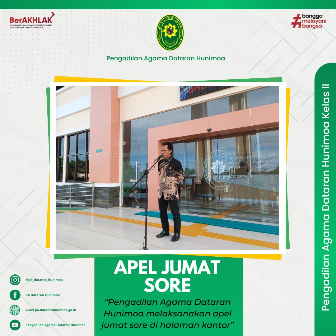 Seram Bagian Timur, 11 April 2025 aparatur Pengadilan Agama Dataran Hunimoa melaksanakan apel jumat sore dihalaman kantor. Panitera Wanardi Syarif, S.H.I selaku pembina pada kesempatan sore ini menyampaikan kepada aparatur Pengadilan Agama Dataran Hunimoa agar lebih meningkatkan semangat dalam bekerja dan tetap menjaga kedisiplinan.