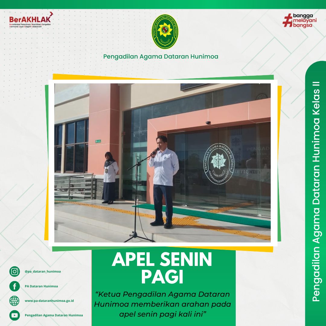 Seram Bagian Timur, 14 April 2025 Pengadilan Agama Dataran Hunimoa melaksanakan apel senin pagi dihalaman kantor. Ketua Bapak Mahdys Syam, S.H,. M.H. selaku pembina apel pagi ini menyampaikan kepada pegawai Pengadilan Agma Dataran Hunimoa Minal Aidzin Walfaidzin mohon maaf lahir dan batin, marilah kita saling memaafkan satu dengan yang lain. Ketua juga menyampaikan agar lebih menjaga kedisiplinan walau ada teman-teman yang masih dalam masa cuti.