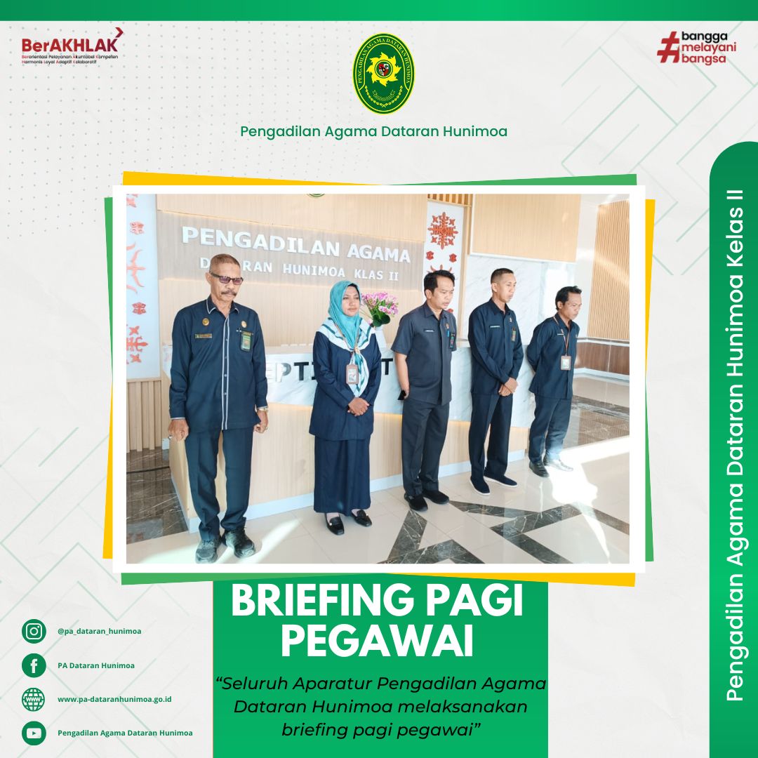 Seram Bagian Timur, 22 April 2025 seluruh aparatur Pengadilan Agama Dataran Hunimoa mengikuti agenda briefing selasa pagi ini. Ketua Bapak Mahdys Syam, S.H., M.H. menyampaikan kepada seluruh pegawai agar lebih memperhatikan kehadiran kita dikantor, ketua juga menyampaikan agar lebih menjaga kebersihan kantor terkhususnya ruang-ruang publik seperti PTSP, ruang tunggu sidang, resepsionis dan harus terus menerapkan 5S dan 5R.