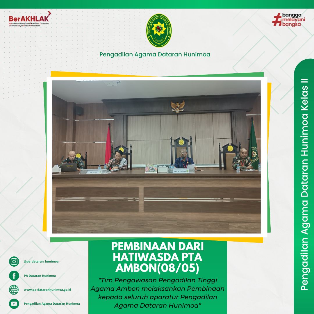 Seram Bagian Timur, 8 Mei 2025 Tim Pengawasan Pengadilan Tinggi Agama Ambon melaksankan Pembinaan kepada seluruh aparatur Pengadilan Agama Dataran Hunimoa Kamis siang kemarin pukul 14:30 WIT. Pembinaan yang dilaksankan oleh Tim Pengawasan PTA Ambon ini dilaksanakn di ruang sidang utama PA Dataran Hunimoa, dalam pembiaan yang disampaikan oleh ketua tim pengawasan yaitu Hakim Tinggi YM Drs. Akhmad Saidi, M.H. beliau menyampaikan pesan dari YM Ketua Pengadilan Tinggi Agama Ambon untuk seluruh aparatur selalu menjaga integritas bai dalam bekerja ataupun di lingkungan masyarakat sesuai dengan pesan Ketua Mahkamah Agung tak hanya itu beliau juga menyampaikan hal-hal terkait apa-apa saja yang perlu ditingkatkan di Pengadilan Agama Dataran Hunimoa.