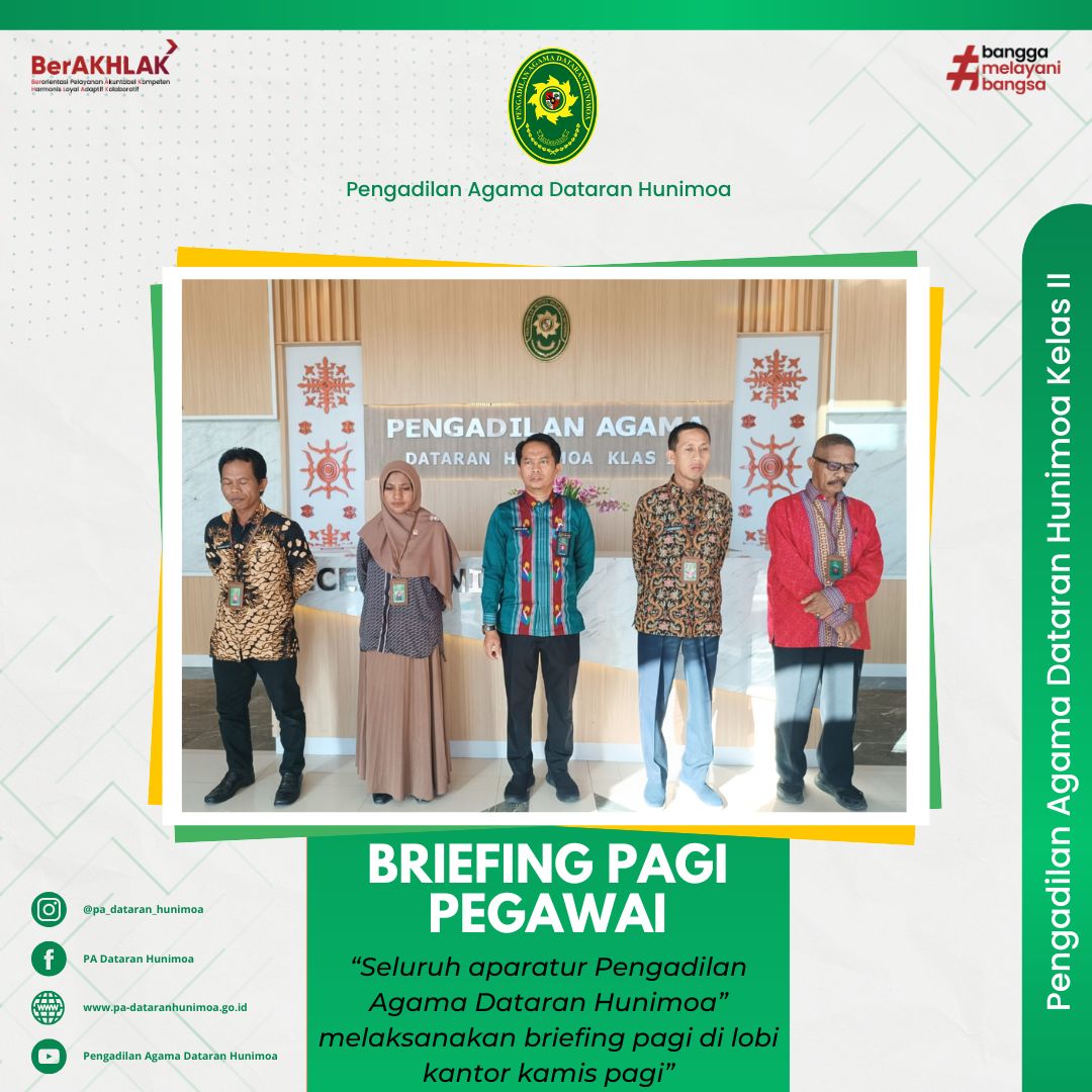 Seram Bagian Timur, 15 Mei 2025 Aparatur Pengadilan Agama Dataran Hunimoa melaksankan briefing pagi di ruang resepsionis. Ketua Bapak Mahdys Syam, S.H.,M.H selaku pembina pada kali ini mengingatkan kepada seluruh aparatur untuk menjaga integritas sebagai pegawai dan juga selalu memberikan pelayanan yang terbaik untuk masyarakat. Tak hanya itu beliau juga menyampaikan bahwa minggu depan akan dilaksankan sosialisasi dari kejaksaan seram bagian timur tentang gratifikasi.