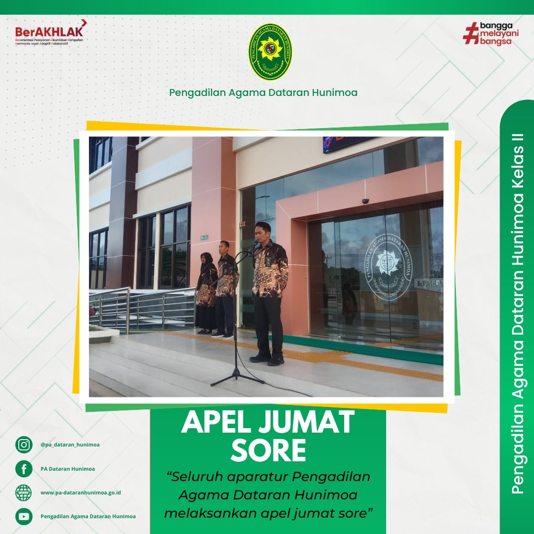 Seram Bagian Timur, 16 Mei 2025 Aparatur Pengadilan Agama Dataran Hunimoa melaksankan apel jumat sore di halaman depan kantor. Dalam apel jumat sore ini ketua berpesan kepada seluruh aparatur untuk selalu menjaga integritas dan selalu mengingatkan juga kepada petugas PTSP untuk menginformasikan kepada para pihak bahwa segala pelayanan di pengadilan itu gratis tanpa dipungut biaya selain di loket kasir.