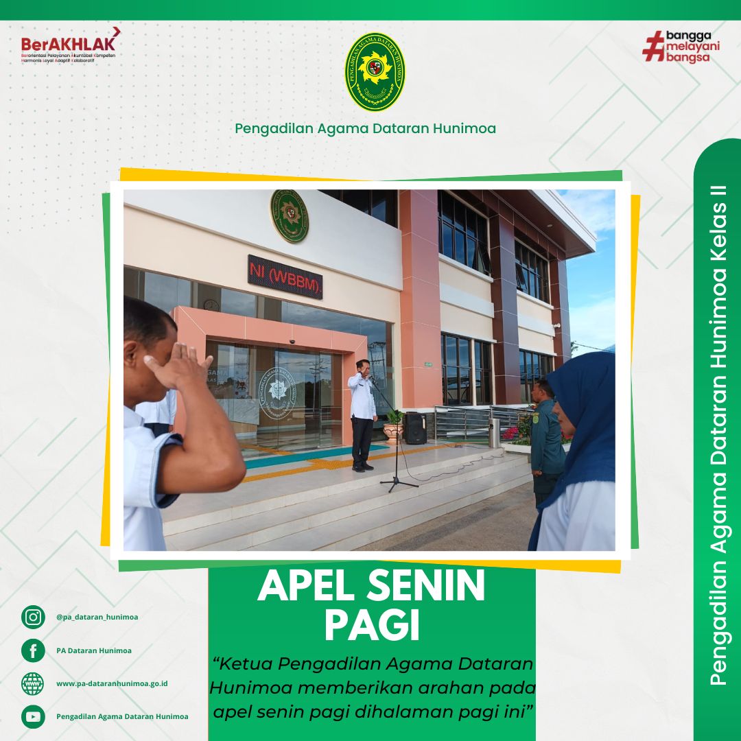 Seram Bagian Timur, 19 Mei 2025 Apel senin pagi Pengadilan Agama Dataran Hunimoa diikuti oleh seluruh aparatur pagi ini. pada kesempatan apel pagi ini ketua menyampaikan kepada seluruh aparatur untuk selalu menjaga integritas, dan agenda di minggu ini akan diadakan upacara hari kebangkitan nasional serta sosialisasi anti gratifikasi juga untuk dipersiapkan. Tak hanya itu beliau juga menyampaikan bahwa nanti akan dilaksanakan rapat ekspose hasil pengawasan bidang di ruang media center.