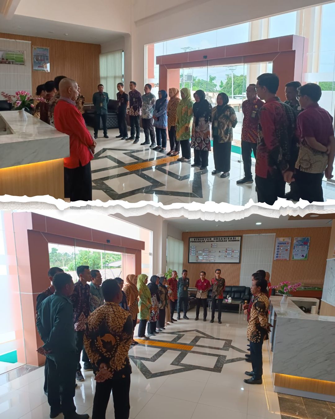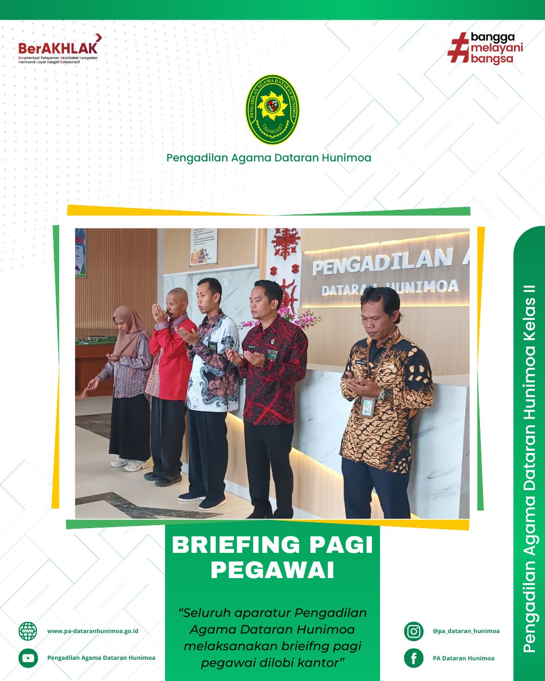 Seram Bagian Timur, 22 Mei 2025 Mengawali kegiatan hari ini seluruh aparatur Pengadilan Agama Dataran Hunimoa melaksanakan briefing pagi di ruang resepsionis pagi ini. Dalam agenda briefing kali ini para aparatur disampaikan untuk selalu bekerja dengan maksimal, agar kinerja yang diberikan di triwulan II nantinya bisa melebihi dari triwulan I Tahun 2025.