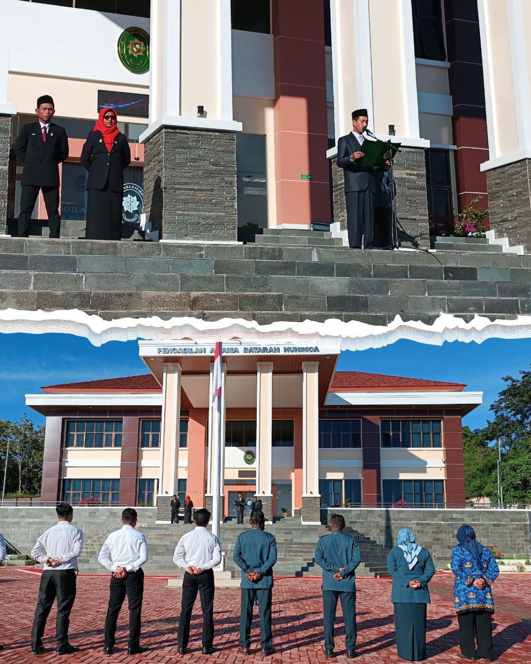 Seram Bagian Timur, 2 Juni 2025 Seluruh Aparatur Pengadilan Agama Dataran Hunimoa melaksankan Upacara Bendera memperingati Hari Lahir Pancasila Tahun 2025 di Halaman Kantor. Agenda upacara yang dilaksanakan tepat pukul 07:00 WIT serta dalam kesempatan pagi kali ini Wakil Ketua Bapak Alamsyah, S.H.I., M.H, selaku pembina upacara menyampaikan amanat dari Kepala Badan Pembinaan Ideologi Pancasila bahwa memperkokoh ideologi Pancasila berarti menegaskan kembali bahwa pembangunan bangsa harus selalu berakar pada nilai-nilai ketuhanan,kemanusiaan, persatuan, kerakyatan, dan keadilan sosial.
