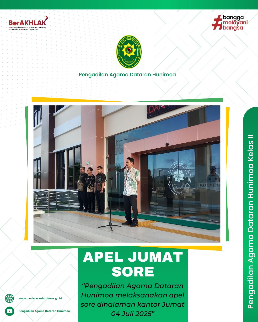 Seram Bagian Timur, 04 Juli 2025 bertempat dihalaman kantor aparatur Pengadilan Agama Dataran Hunimoa melaksanakan apel jumat sore. Ketua Bapak Mahdys Syam S.H., M.H, selaku pembina pada kesempatan kali ini menyampaikan mengenai dateline kepatuhan penyampaian pengisian ETR, SKP, Sikep dan Sipintar sesuai cut offnya agar kedepan jadi perhatian agar dilaksanakan tepat waktu.
