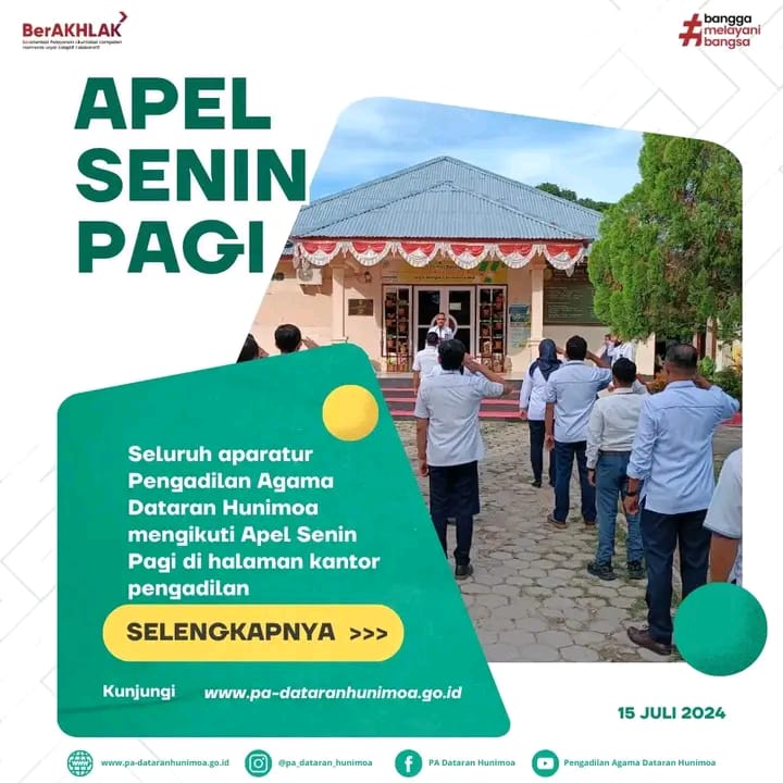 Bula, 15 juli 2024 bertempat di halaman kantor Pengadilan Agama Dataran Hunimoa telah dilaksanakan rutinitas apel pagi yang diikuti oleh Pimpinan dan seluruh aparatur Pengadilan Agama Dataran Hunimoa. Yang Bertindak sebagai Pembina pada apel tersebut bapak Samsudin Narahaubun, S.H.I. Sebagai Sekretaris Pengadilan Agama Dataran Hunimo, dalam kesempatan tersebut beliau menyampaikan pembinaanya, agar seluruh aparatur Pengadilan Agama Dataran Hunimoa agar selalu membangun kerjasama dan komunikasyang baik diantara para pegawai, agar pelayanan terhadap Masyarakat pencari keadilan di kabupaten seram bagian timur dapat berjalan dengan baik.