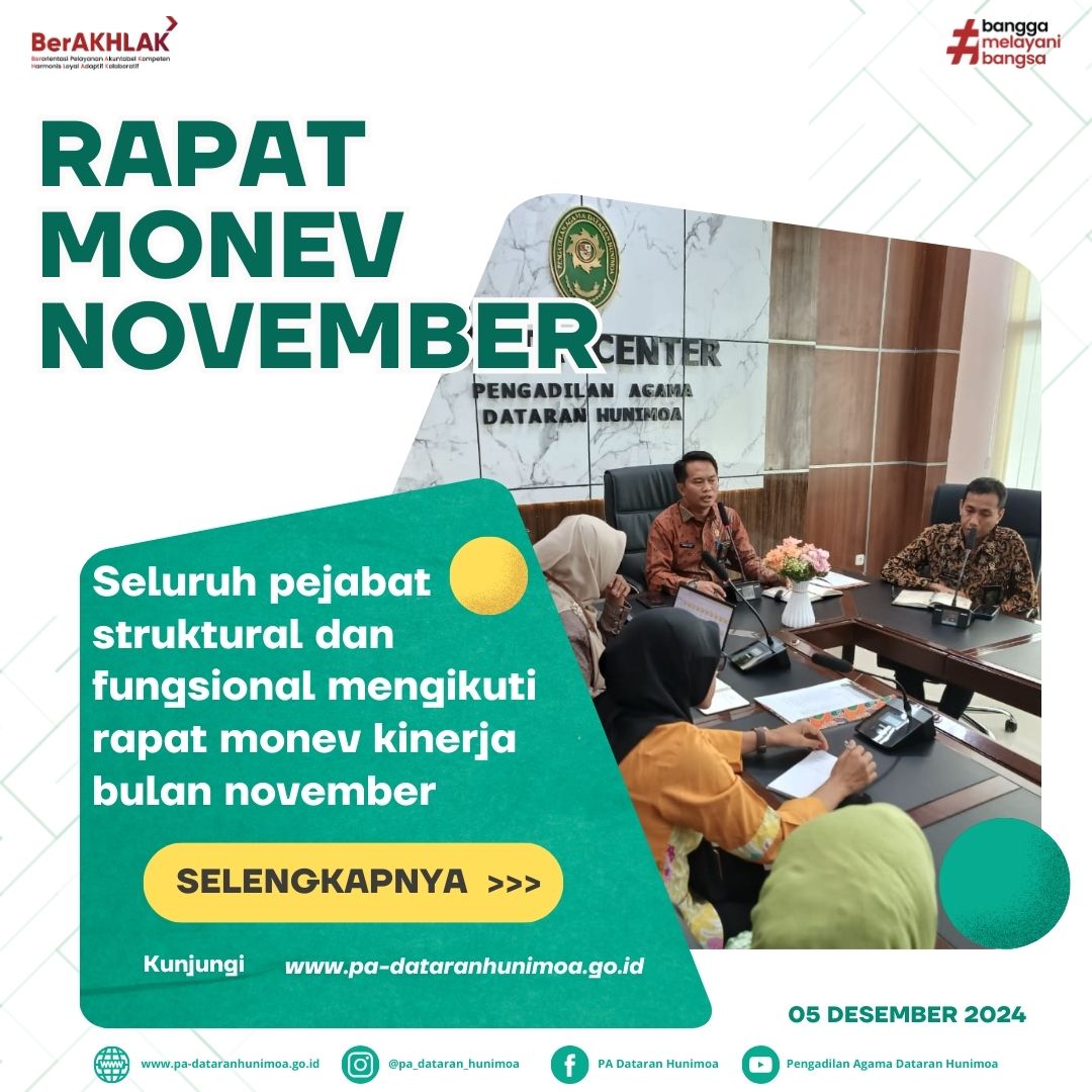 Seram Bagian Timur, 05 Desember 2024 Pejabat Struktural dan Fungsional Pengadilan Agama Dataran Hunimoa mengikuti rapat monitoring dan evaluasi kinerja bulan oktober di ruang media center kamis pagi ini. Dalam agenda rapat monitoring dan evaluasi kinerja ini ketua menyampaikan harap di pedomani SK Dirjen Badilag nomor 1462 tahun 2023 padal 17 ayat 2 tentang surat tercatat berikutnya perhatikan Langkah langkah akhir tahun untuk mengatur realisasi anggaran dan di buat jadwal untuk penyerapan anggaran dapat dilaksanakan dengan baik.