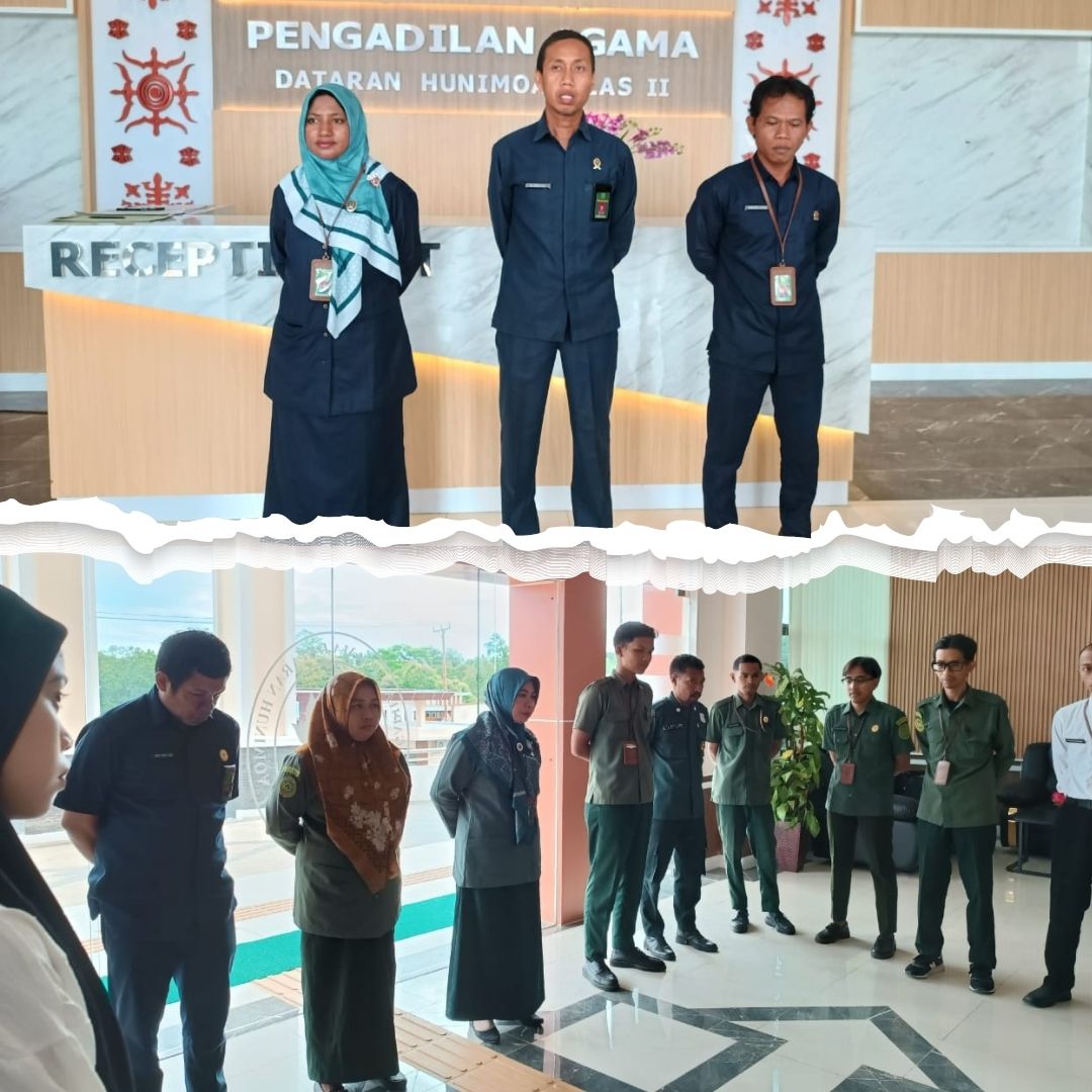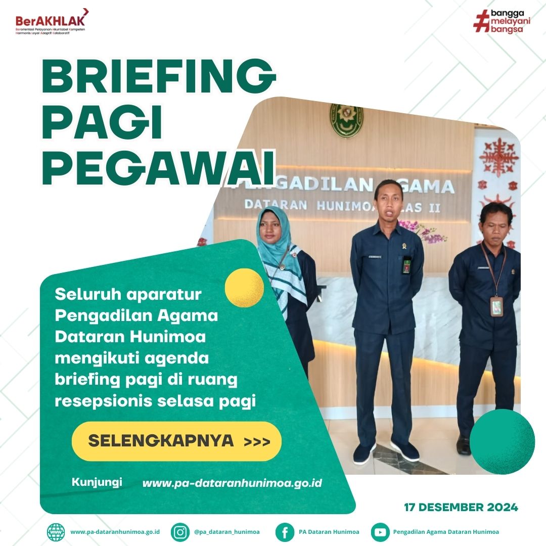 Seram Bagian Timur, 17 Desember 2024 Seluruh aparatur Pengadilan Agama Dataran Hunimoa mengikuti agenda Briefing Pagi Pegawai di ruang resepsionis. Wakil ketua bapak Alamsyah, S.H.I.,M.H selaku pembina menyampaikan kepada bagian kepegawaian agar dapat membuat ulang jadwal piket kebersihan, dan agar petugas kebersihan dapat memperhatikan kebersihan ruang-ruang pelayanan publik.
