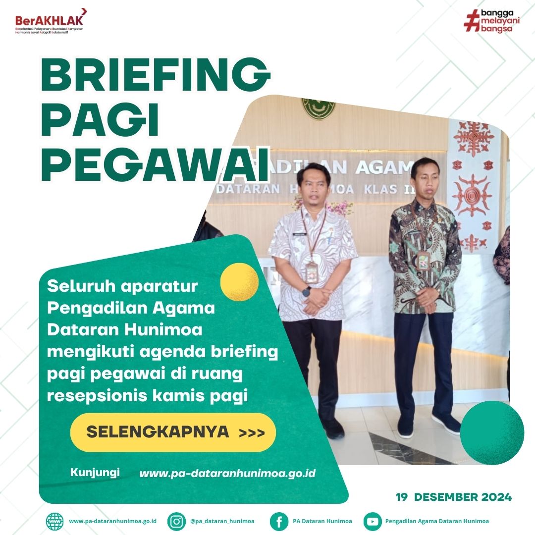 Seram Bagian Timur, 19 Desember 2024 Seluruh aparatur Pengadilan Agama Dataran Hunimoa mengikuti agenda Briefing Pagi Pegawai di ruang resepsionis. Ketua Bapak Mahdys Syam, S.H menyampaikan kepada para pegawai untuk menyiapkan ruang sidang karena akan dilaksanakan persidangan secara virtual, Ketua juga menambahkan bahwa untuk segera menindaklanjuti hasil temuan Hakim Pengawas Bidang.
