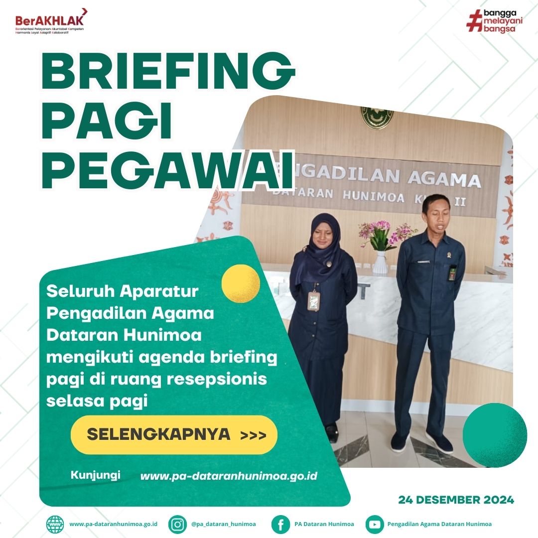 Seram Bagian Timur, 24 Desember 2024, Wakil Ketua Pengadilan Agama Dataran Hunimoa memberikan briefing pada seluruh aparatur Pengadilan Agama Dataran Hunimoa pagi ini. Beliau mengingatkan untuk seluruh aparatur untuk segera menyelesaikan hasil temuan bidang dan mengingatkan kepada seluruh aparatur untuk segera menyelesaikan SKP Triwulan IV dan Tahunan 2024 sesuai dengan arahan Ketua Pengadilan Agama Dataran Hunimoa maksimal tanggal 31 Desember 2024.