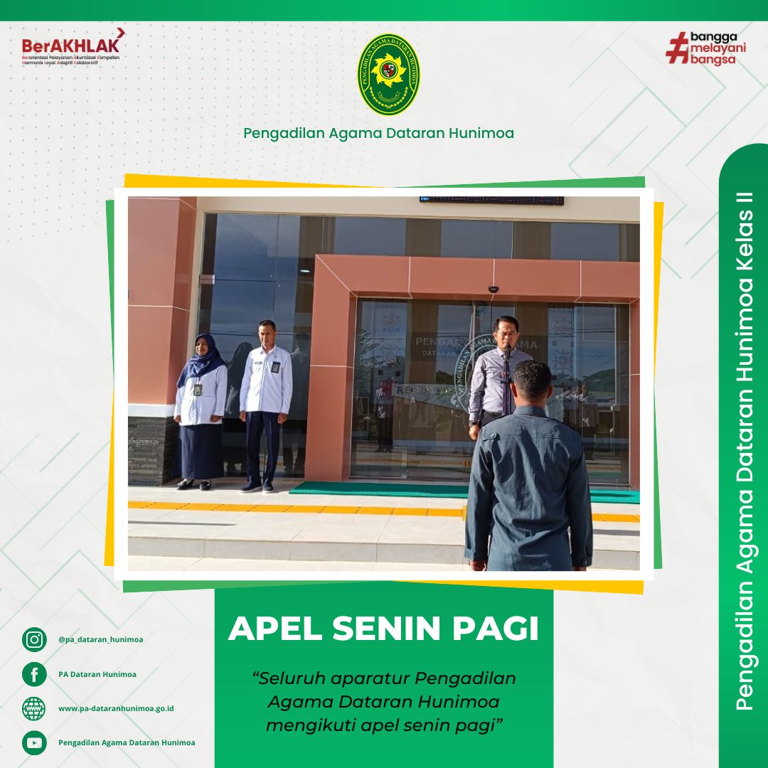 Seram Bagian Timur, 6 Januari 2025 Seluruh aparatur PA Dataran Hunimoa mengikuti agenda apel senin pagi di halaman kantor pengadilan. Apel hari ini ialah apel senin pagi perdana di tahun 2025, Ketua selaku pembina pada kesempatan kali ini menyampaikan pembinaan terkait surat edaran dirjen badilag nomor 5 tahun 2024 tentang penegasan impelentasi pembangunan zona integritas pimpinan, hakim dan aparatur di lingkungan peradilan agama.