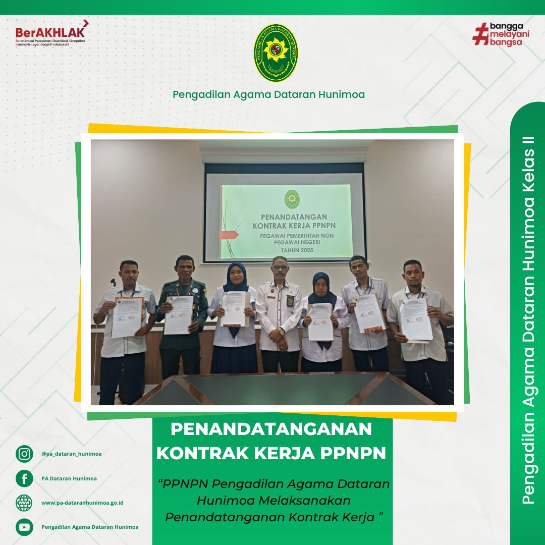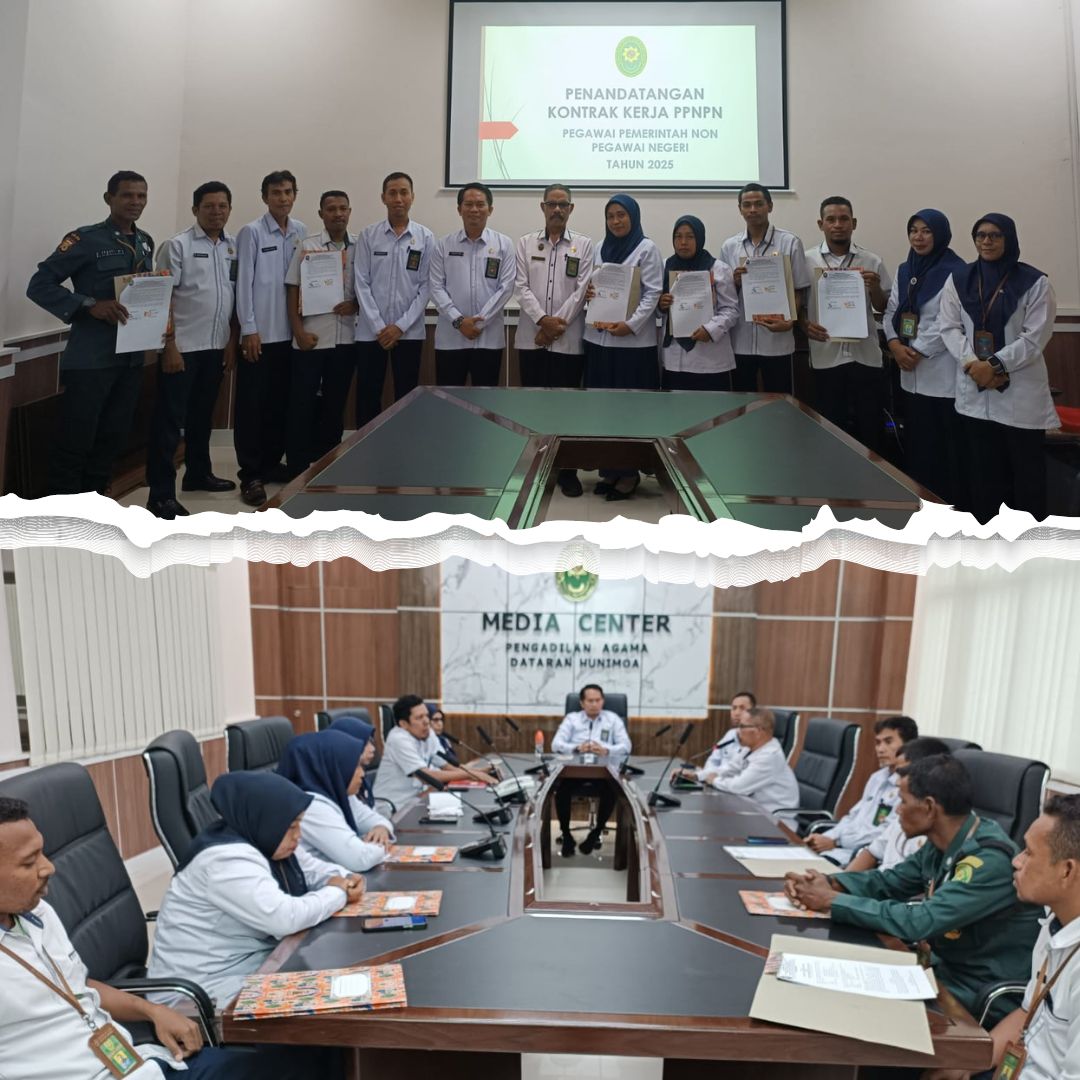 Seram Bagian Timur, 13 Januari 2025 Pegawai Pemerintah Non Pegawai Negeri (PPNPN) Pengadilan Agama Dataran Hunimoa melaksanakan penantanganan kontrak kerja tahun 2025 di ruang media center. Dalam penandatangan kontrak kerja ini dilaksanakan secara langsung di hadapan Sekretaris PA Dataran Hunimoa serta di saksikan oleh Ketua dan Wakil Ketua Pengadilan Agama Dataran Hunimoa.