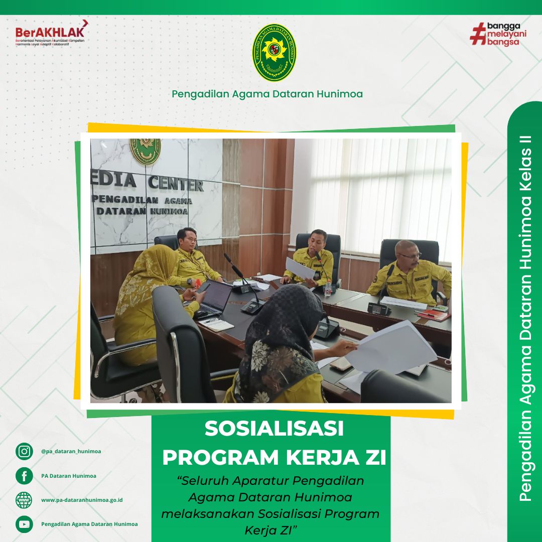 Seram Bagian Timur, 22 Januari 2025 Ketua Tim Zona Integritas Pengadilan Agama Dataran Hunimoa melaksanakan sosialisasi program kerja zona integritas tahun 2025. Sosialisasi ini dilaksanakan di ruang media center dan diikuti seluruh koordinator dan anggota tim ZI Pengadilan Agama Dataran Hunimoa.