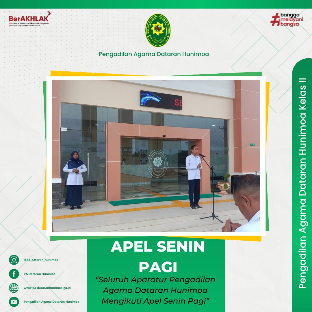 Seram Bagian Timur, 3 Februari 2025 Aparatur Pengadilan Agama Dataran Hunimoa mengikuti apel senin pagi di halaman kantor. Wakil Ketua selaku pembina pada kesempatan kali ini menyampaikan kepada seluruh aparatur untuk menyambut awal bulan dengan penuh semangat mari tingkatkan kinerja kita, maksimalkan kinerja kita dibulan februari ini dan selalu menjaga integritas, kedisiplinan & semangat kerja di setiap harinya.