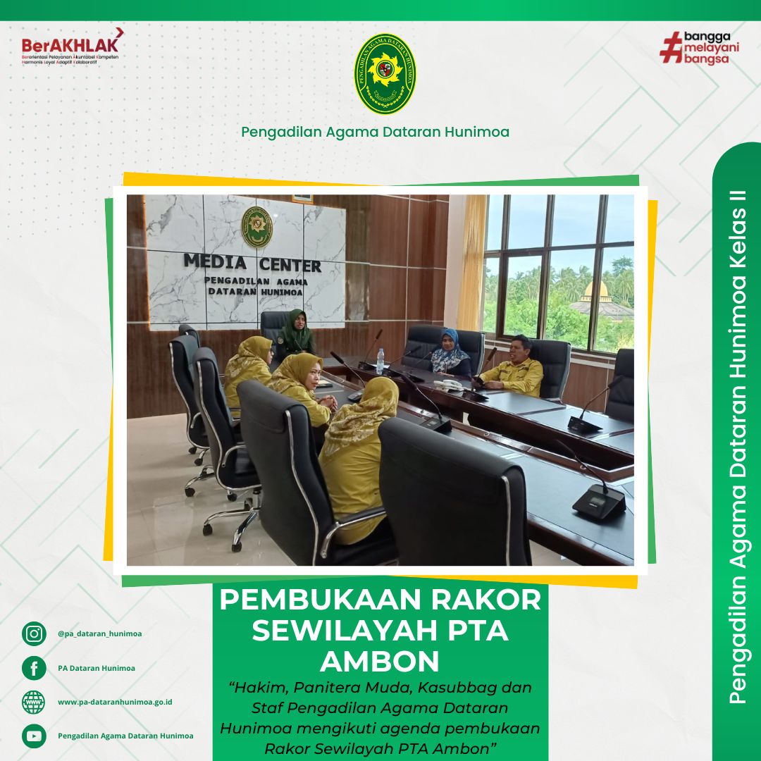 Seram Bagian Timur, 12 Februari 2025 Hakim, Panitera Muda, Kasubbag dan Staf Pengadilan Agama Dataran Hunimoa mengikuti agenda pembukaan Rapat Koordinasi di Media Center secara daring. Agenda Pembukaan Rapat Koordinasi Sewilayah PTA Ambon ini diikuti oleh seluh Pengadilan Agama di wilayah PTA Ambon secara daring.