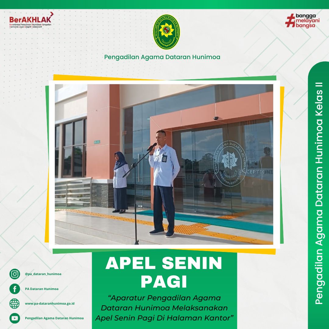 Seram Bagian Timur, 17 Februari 2025 aparatur Pengadilan Agama Dataran Hunimoa melaksanakan apel senin pagi dihalaman kantor. Wakil Ketua Alamsyah, S.H,I, M.H selaku pembina pada kesempatan pagi ini menyampaikan kepada aparatur Pengadilan Agama Dataran Hunimoa agar selalu selalu menjaga kedisiplinan dan kita harus berlomba-lomba dalam kebaikan agar kita dapat memberikan pelayan yang baik kepada para pihak.